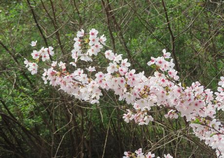 桜はのびのびと育っていたのですが、ここ数年は隣接の畑(次写真の向こう側)が耕作放置地となり雑草と雑木が繁って、花も枝も窮屈な想いをしています。したがって手前から撮影することになりますが、逆光で花ビラの美しさを伝えられないのが残念です。